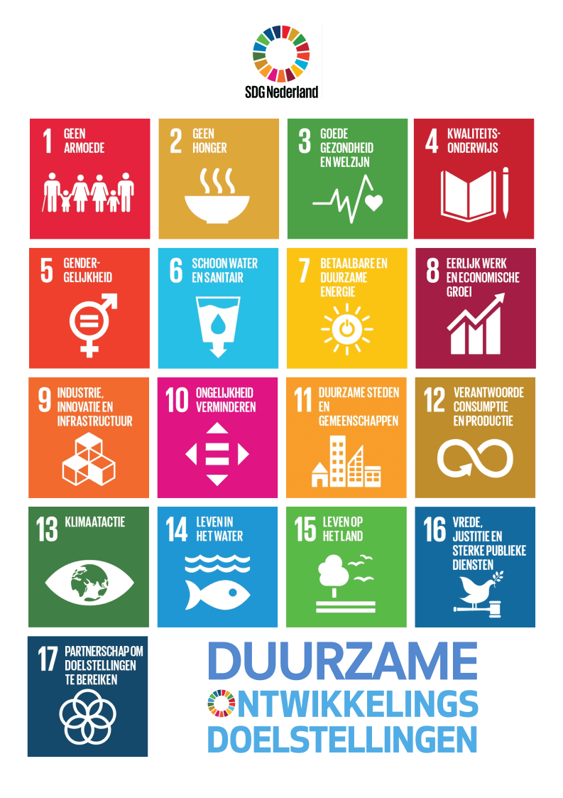 De sustainable development goals (SDG’s) komen uit ‘’the 2030 agenda for sustainable development’’ van de verenigde naties. Dit is gelanceerd in 2015 als onderdeel van de 2030 agenda. Alle VN lidstaten hebben met elkaar afgesproken om de 17 doelstellingen, die samen de SGD’s vormen, uiterlijk 2030 te behalen. Hieronder staan alle 17 doelstelling op een rij.
