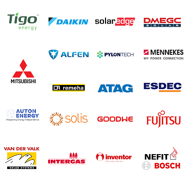 Auton Energy, Atlantic, Pylontech, Alfen, Mennekes, Inventor, ATAG, Remeha, Nefit, Intergas, Fujitsu Atlantic, Daikin, Mitsubishi, Dmegc, Tigo Energy, Solis, GoodWe, Esdec, Van der Valk, Solar Edge en ABL.