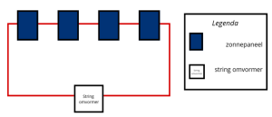 Een optimizer zorgt ervoor dat jij de meest optimale opbrengst hebt met jou zonnepanelen. Met de string omvormer zijn je panelen net zo gelinkt als een string lampjes. Als er 1 uitvalt of minder opbrengt, dan heeft de rest dat ook. Dit geld ook voor de zonnepanelen met string omvormers, het ziet er uit als 1 grote kring. Zoals in onderstaande afbeelding te zien is. als 1 van de panelen deels in de schaduw valt, wekt het minder op. De grotere winst van de andere panelen blijft dan ook liggen.