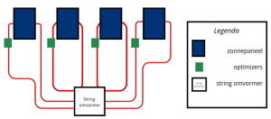 De optimizer koppelt dit los in allemaal kleine kringetjes. Op deze manier kan alles wat het paneel opgewekt wordt, gebruikt worden en blijft er niks achter.